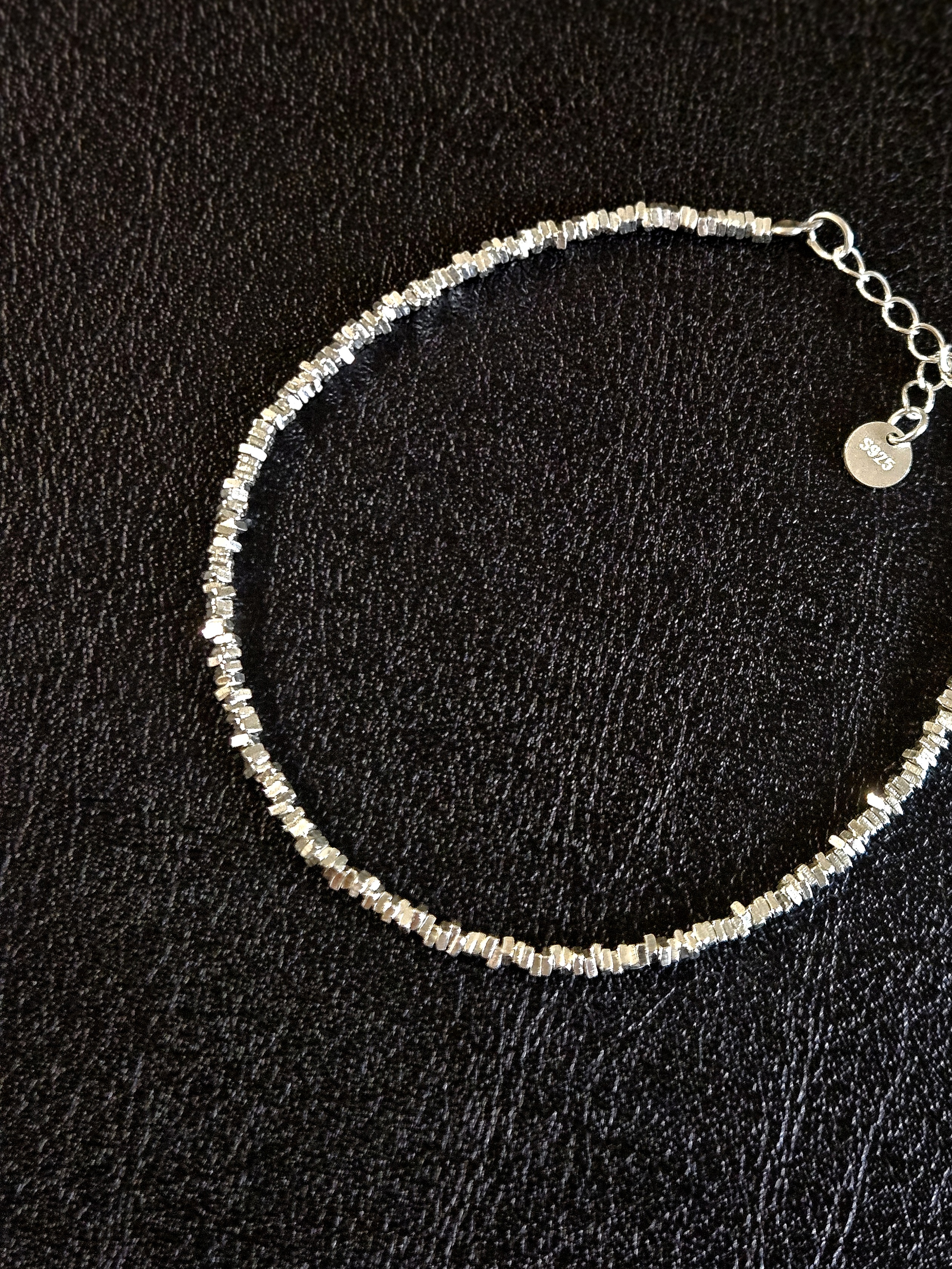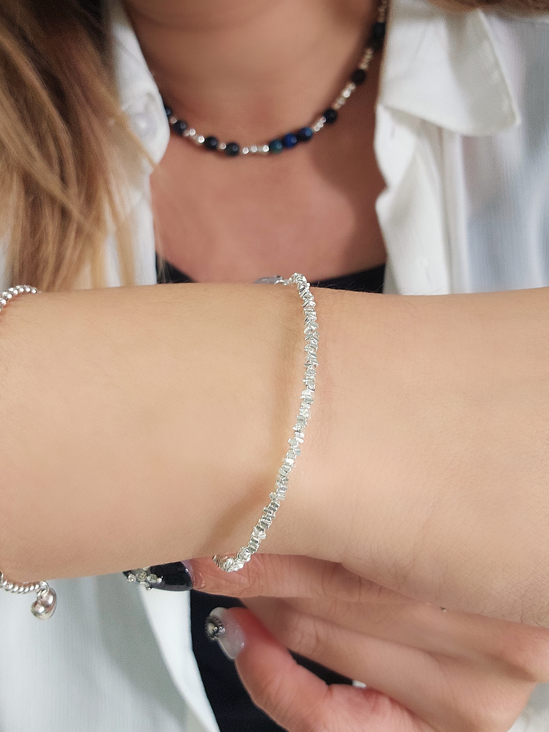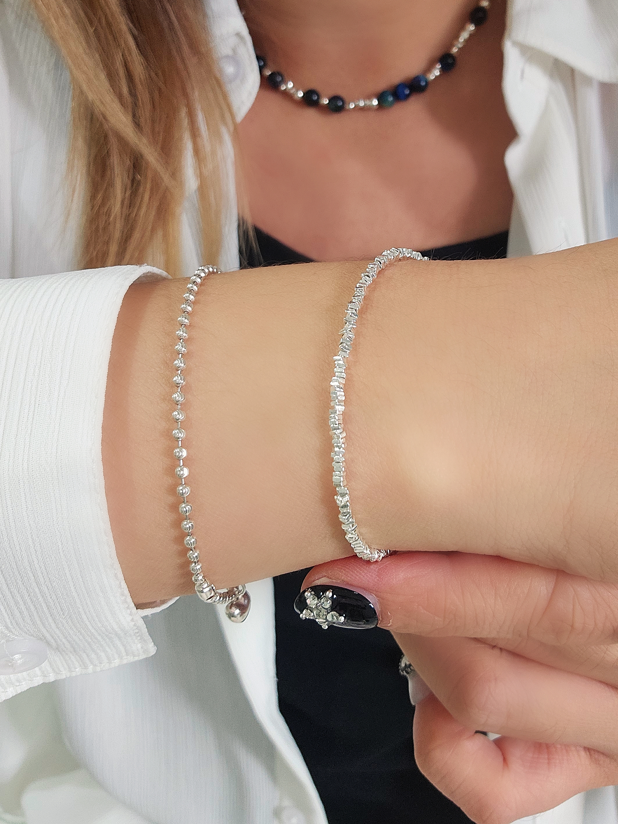 這款手鍊是我們自家設計,由不規則形狀的純銀粒(1.6mm)串成,每一顆銀粒都展現出獨特的質感與厚實感。採用日本鋼絲線,佩戴舒適且耐用。 精心設計的手鍊既時尚又充滿個性,適合各種場合佩戴。我們提供手圍訂製服務,確保每一條手鍊都能完美貼合您的手腕,帶給您最舒適的佩戴體驗。 Bracelet SIZE: 16+2.5cm WEIGHT: 4.6g 🔸️S925 🔸️Easy to match 🔸️Hypoallergenic 🔸️Keep Dry For Lasting Shine 〰️What's Included〰️ 1 Chain Bracelet 1 High Quality Sealed Bag 1 High Quality Silver Polishing Cloth ♥️ 尺寸: 16+2.5cm 重量: 4.6g 🔸️S925 🔸️容易配襯 🔸️防敏感 🔸️保持乾燥 持久光澤 〰️包括什麼〰️ 1 手鍊 1 高質密封袋 1 高質抹銀布
