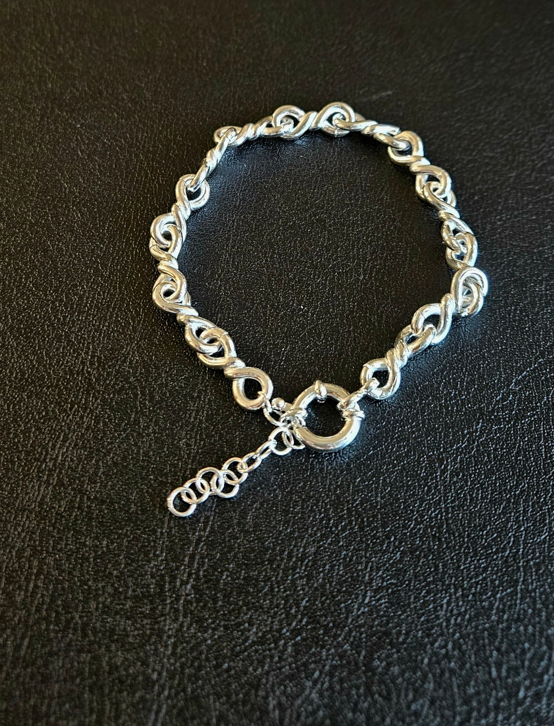 嘿!想為你的造型增添一點個性與質感嗎?這款純銀扭紋手鐲絕對能滿足你!它不像一般細緻的手鍊,而是帶有粗獷風格,讓你一眼就注意到它的存在感。這款手鐲採用高品質純銀打造,經過細緻的扭紋工藝處理,呈現出獨特的視覺效果,讓你的手腕更顯魅力。