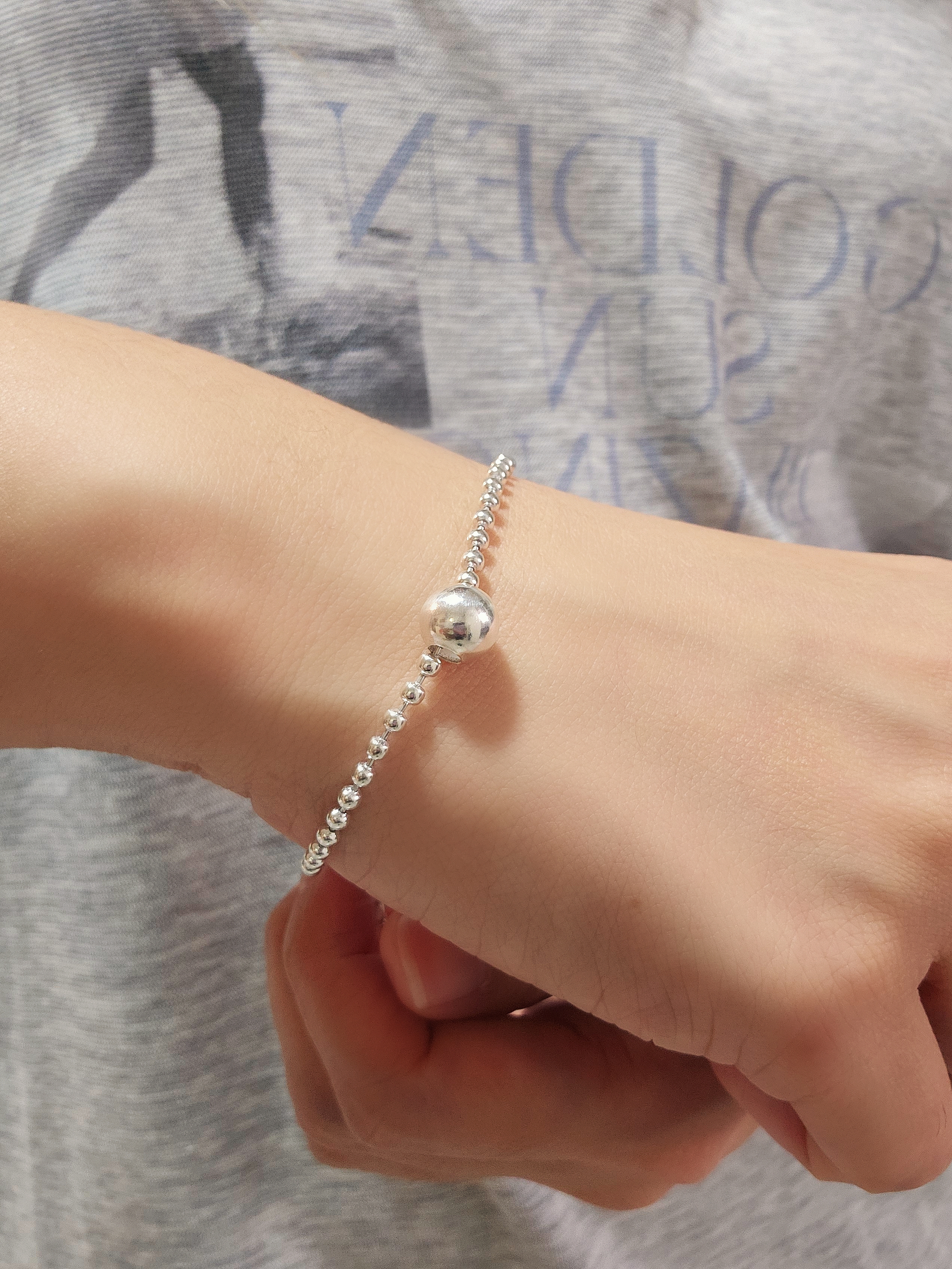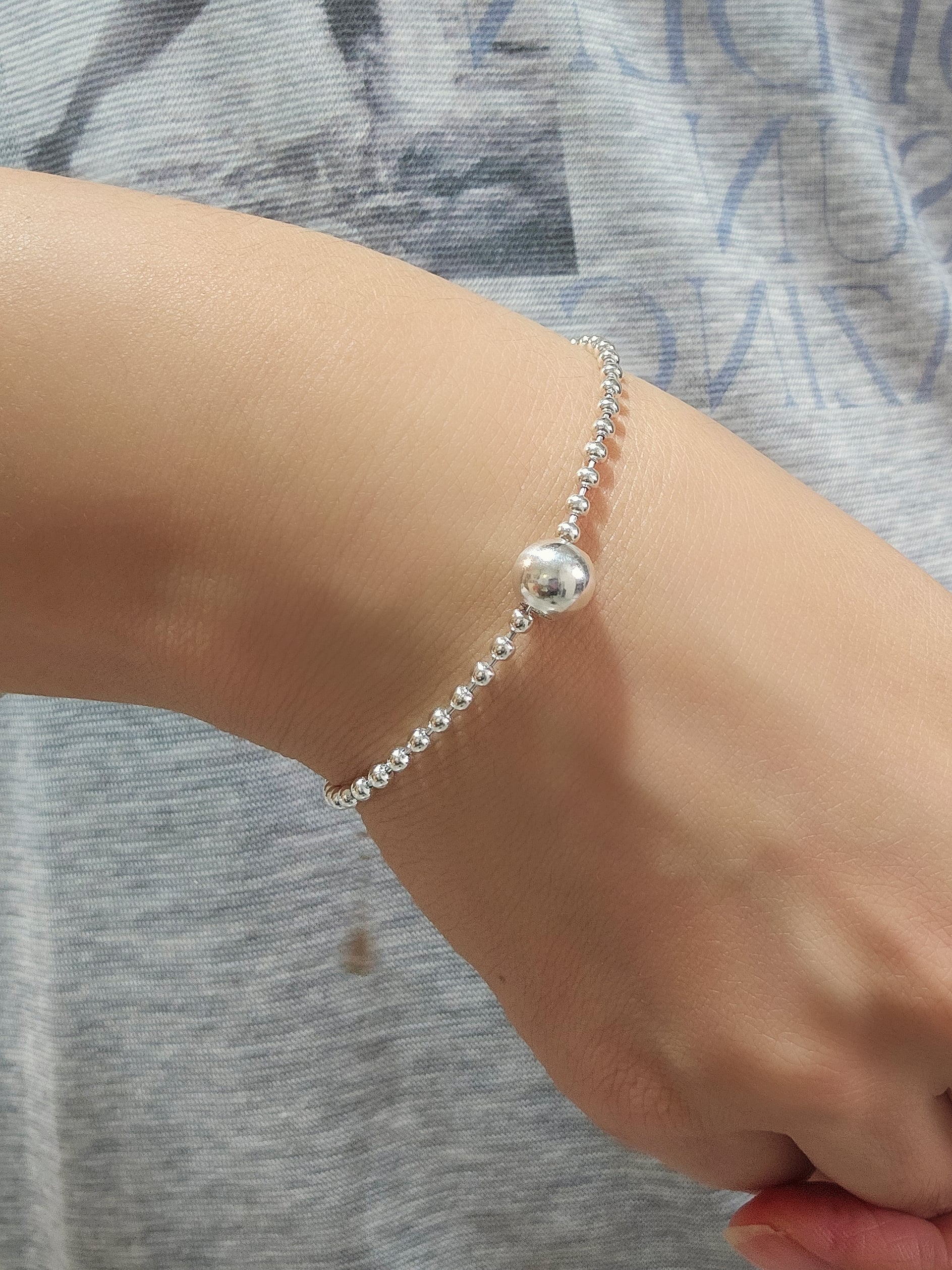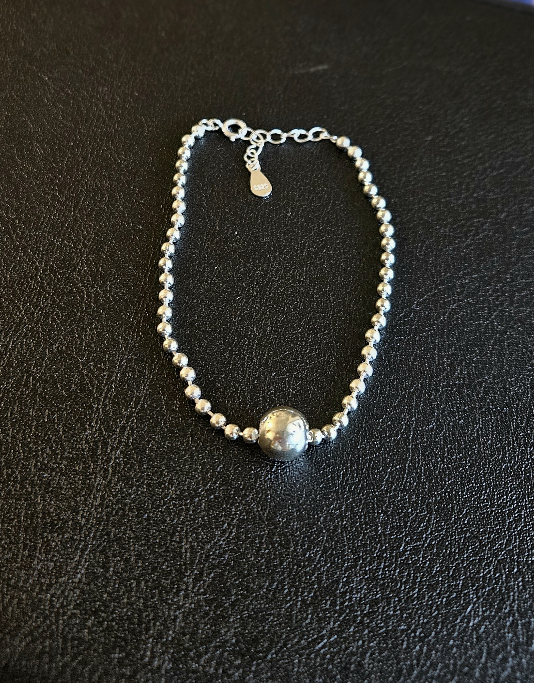 手鍊主體以純銀打造,散發著低調溫潤的光澤,質感滿分。最特別的是,手鍊中央有一顆較大的純銀珠,這顆珠子是可以自由活動的!讓它在手腕上靈動滑動,增添一絲趣味和個性。想像一下,在陽光下,銀珠隨著您的動作閃爍,是不是讓人心情愉悅呢?