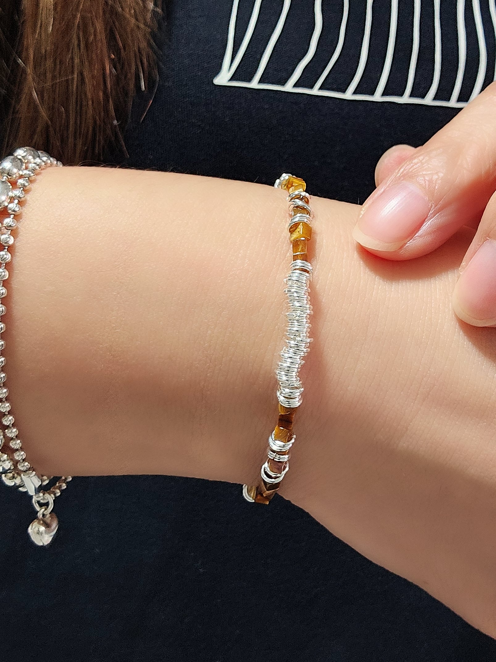 這款虎眼石手鍊由小巧的立方珠串聯而成,珠子顏色呈現出金黃至紅棕色的絹絲光澤,富有質感。手鍊上還點綴著幾個銀色的線圈裝飾,增添了時尚感。