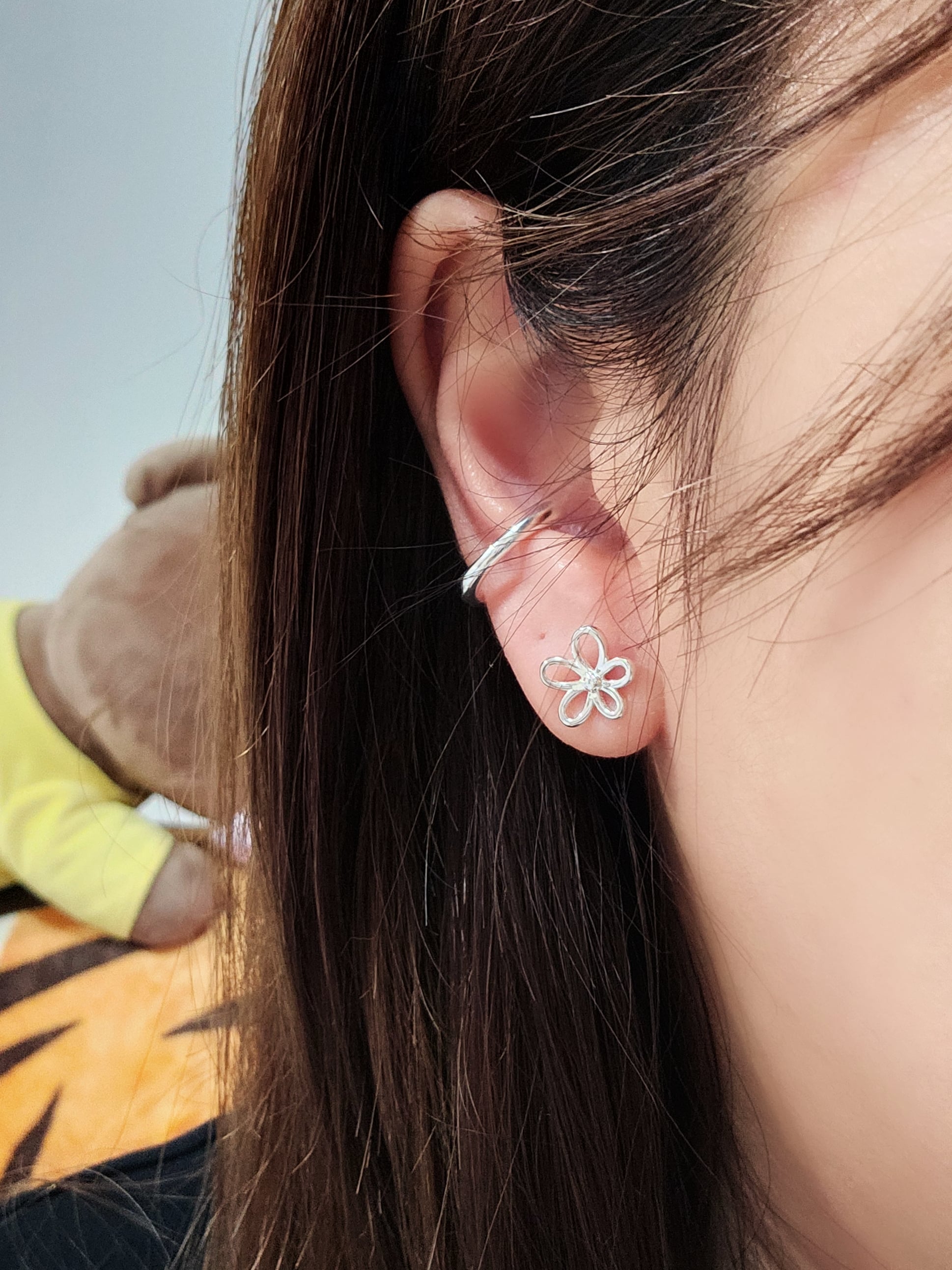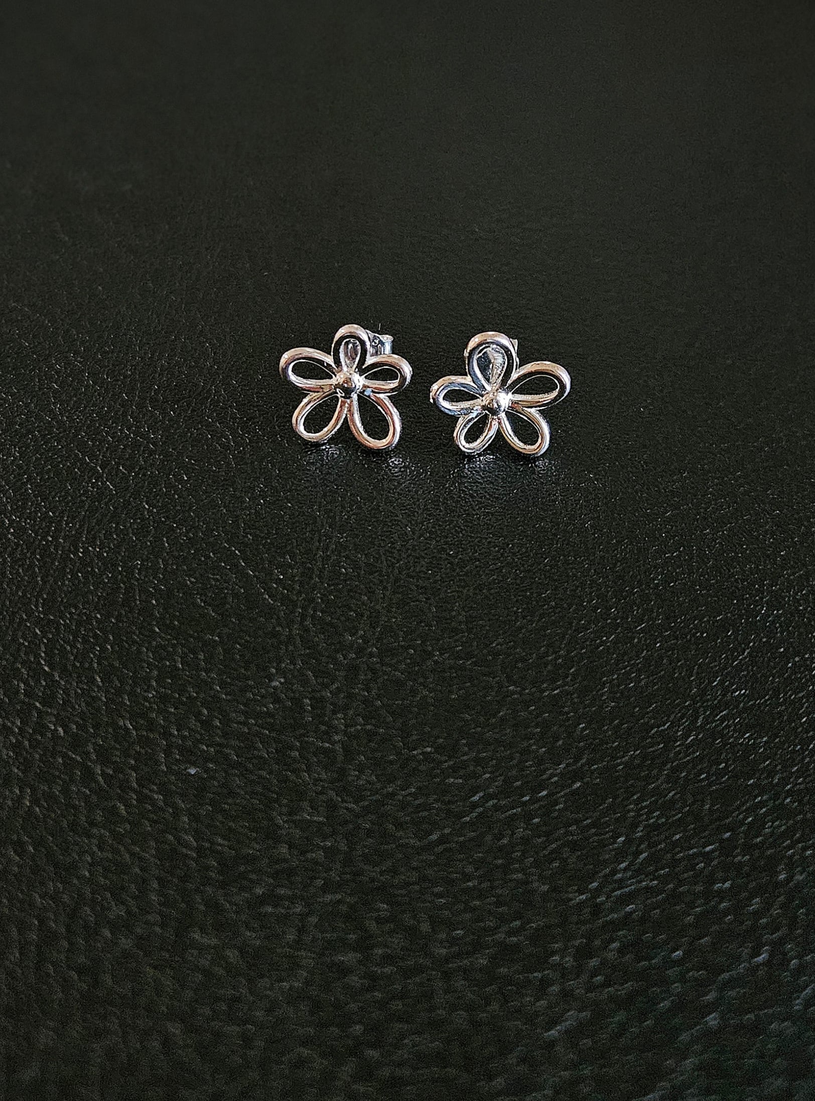 這款純銀花形耳環設計精緻,每一對耳環都由五瓣花和中央小銀珠組成。花瓣由銀線圈成,增添了耳環的細膩和優雅感。