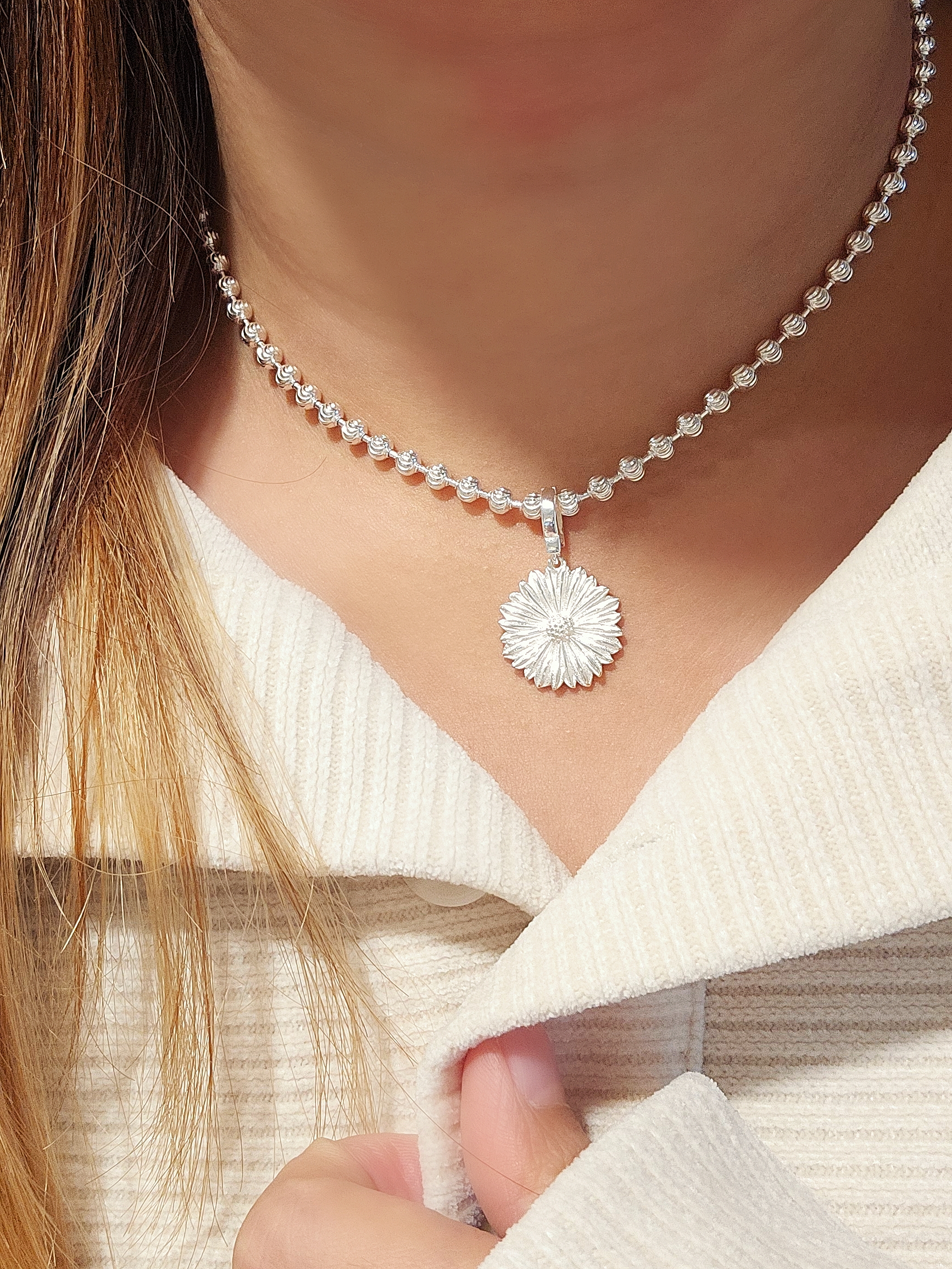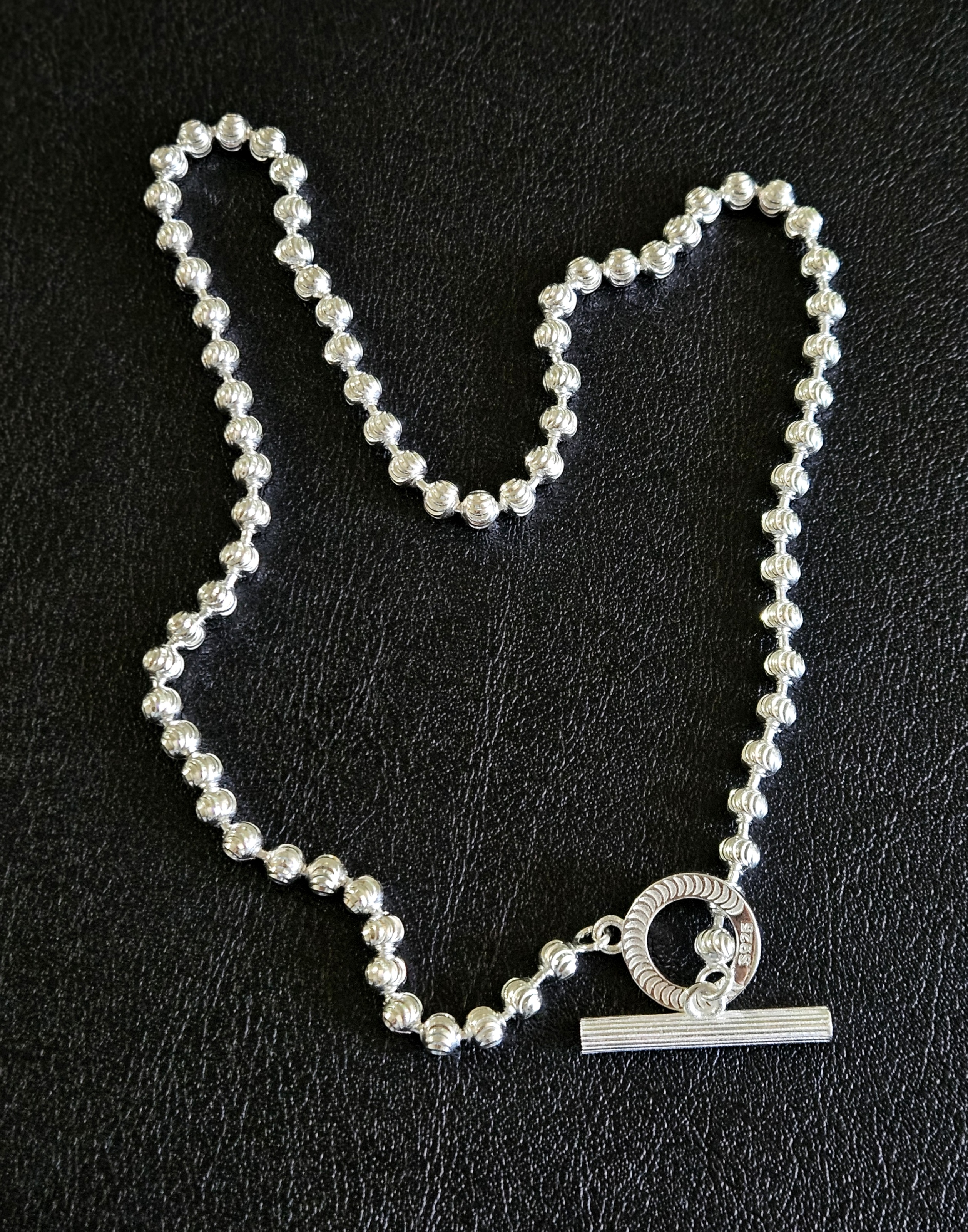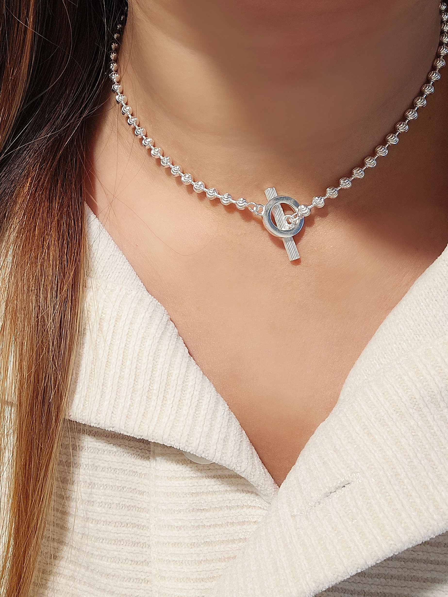 銀色鏈身配上明顯的 Toggle Clasp(穿扣式扣環),簡約卻不失精緻的設計,讓你在日常穿搭中輕鬆展現個人魅力。採用高品質S925純銀打造,確保了其耐用性和光澤,讓你長期佩戴也能保持閃耀。 最貼心的是這條頸鏈採用了TC扣設計,讓你一個人也能輕鬆穿戴,不再需要別人幫忙。仔細觀察你會發現,O型和I型扣都經過精緻的批花工藝處理,呈現出極為細膩的紋路,足見其製作的用心。 這條頸鏈的鏈身由一顆顆直徑約4mm的銀珠串聯而成,更令人驚豔的是,每一顆銀珠都經過了批花工藝的打磨,在光線的照射下,猶如無數的小星星般閃爍,讓你的頸部更加吸睛。 短鏈的設計不僅能突顯頸部線條,更展現出個性與活力。同時,它也具備極佳的搭配性,你可以根據自己的喜好和心情,隨意加上吊墜,打造出屬於你獨一無二的風格。無論是簡約的幾何圖形,或是充滿個性的卡通人物,都能在這條S925純銀頸鏈上找到完美的歸宿。 總而言之,這是一款兼具美觀、實用和多變性的飾品,絕對是你的時尚好夥伴! Necklace SIZE: 39cm WEIGHT: 15.9g 🔸️S925 🔸️can be stacked with necklace 🔸️Hypoallergenic 🔸️Keep Dry For Lasting Shine 〰️What's Included〰️ 1 Necklace 1 High Quality Sealed Bag 1 High Quality Silver Polishing Cloth ♥️ 尺寸: 39cm 重量: 15.9g 🔸️S925 🔸️可與其他項鍊疊戴營造層次感 🔸️防敏感 🔸️保持乾燥 持久光澤 〰️包括什麼〰️ 1 項鍊 1 高質密封袋 1 高質抹銀布